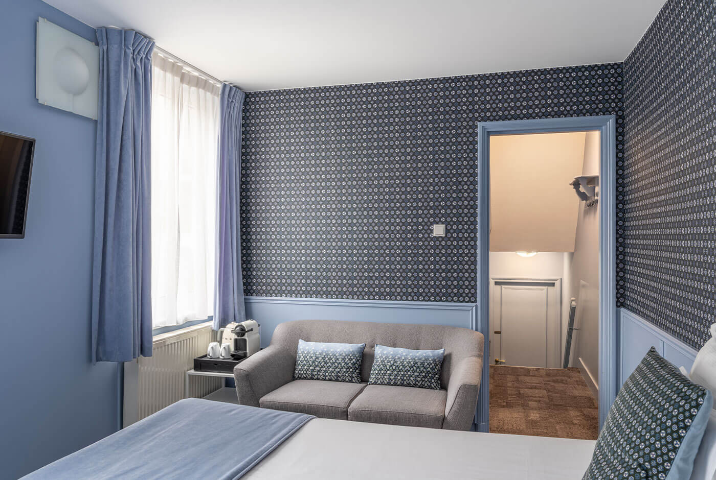 Quiet and cosy — that’s what this room is all about. Designed as a peaceful retreat, it offers a warm and inviting atmosphere where you can truly unwind. Large windows flood the space with natural daylight throughout the day, enhancing the room’s calm ambience and making it an ideal setting for a romantic getaway or a relaxing escape from everyday life.